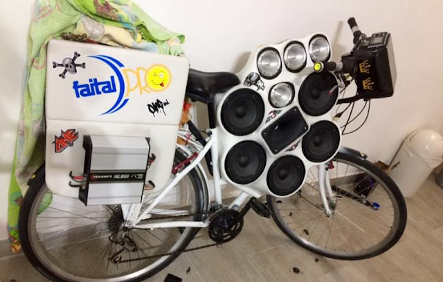 The typical setup of a tricked out stereo cycle in Palermo consists of a head unit on the handlebar, speakers and tweeters in the middle section of the bike, between the seat post and the handlebar, and amplifiers, subwoofers and car batteries in the back.